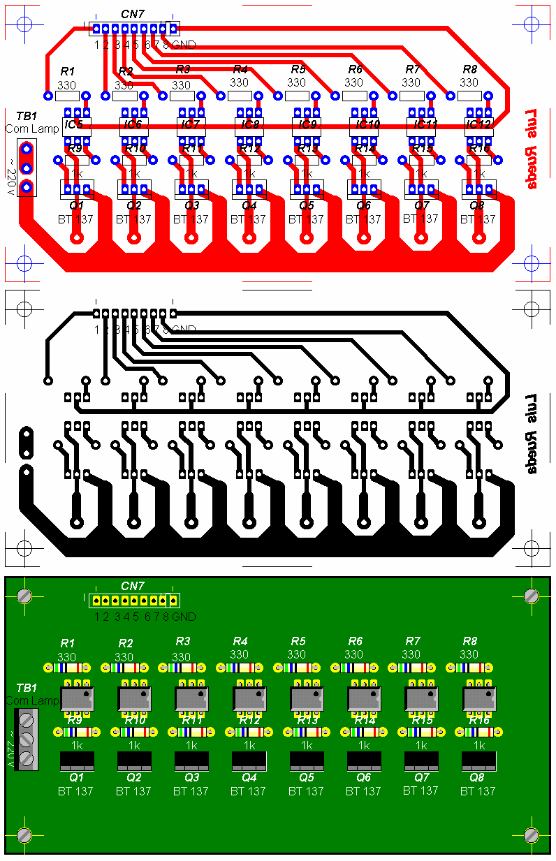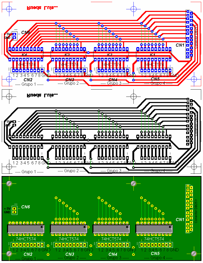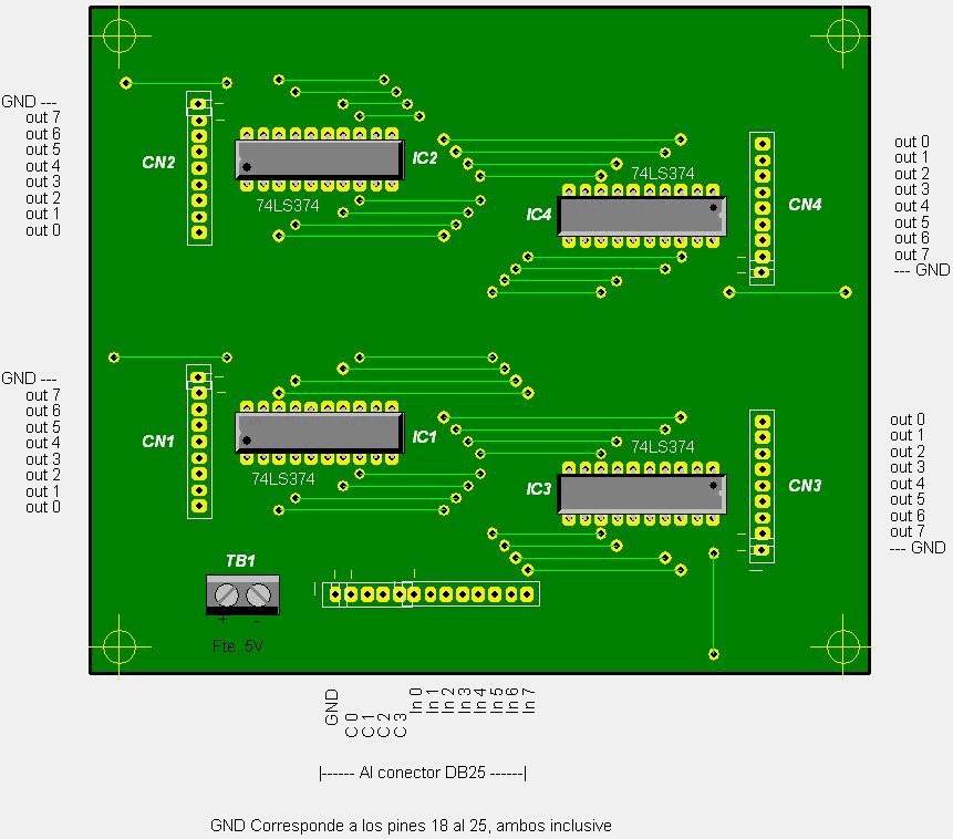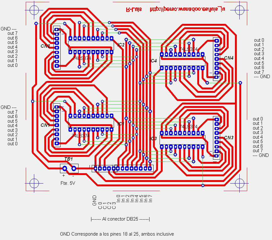 Aquí tienes un par de imágenes del pcb tanto para la interfaz como para la etapa de potencia, esta interfaz está diseñada para el integrado 74HCT574.