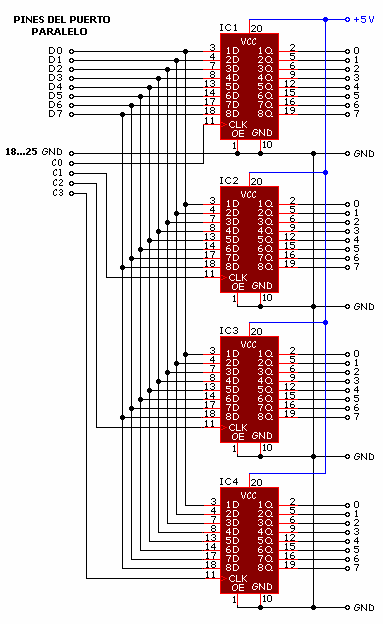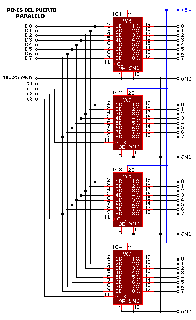 El esquema del circuito es muy sencillo, y consiste en la implementación de 4 integrados similares, que comparten el bus de datos del puerto paralelo, cada uno de estos integrados se habilitan mediante el pin CLK conectado a los pines de control del puerto paralelo de tal forma que el esquema del circuito es el siguiente...