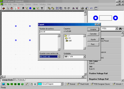 Lo primero que hice, fue marcar cuatro puntos de perforación, con la herramienta Pad Tool, disponible en la barra de herramientas, sin agregar nada más en el área de trabajo, desde el menú File --> Export... , seleccioné la opción NC Drill(*.drl) y lo llamé uno.drl, tal como se ve en la siguiente imagen
