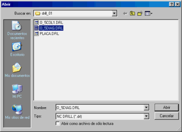 Como verás, en el cuadro Tipo de archivo nos aparece NC DRILL (*.drl), y el archivo seleccionado es el que abriremos, ahora, observa donde aparecerá su contenido...