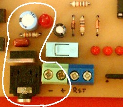 Como la idea es utilizarlo con baterías, no le puse diodos de rectificación, sino más bien un regulador de tensión (7805) para mantenerlo a 5 volts. Ahora bien, posee dos conectores, uno de ellos es para cuando lo utilizemos como entrenador, ya que por lo general disponemos de una fuente rectificada y una ficha tipo plug, el otro conector es simplemente una bornera (aquella de color verde, justamente para identificarla), allí se encuentran marcados los polos de conexión, para así evitar errores, todo esto lo puedes ver en la siguiente imagen...