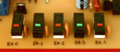 Al puerto A, le puse unos pulsadores (sacados del mouse), están colocados de tal modo que tengas la posibilidad de seleccionar la polaridad de los mismos, mediante un jumper de tres puntos (J1), donde el punto medio es el común de los pulsadores, y sus extremos son los polos positivo y negativo, esto nos dá la libertad de elegir el tipo de señal que se enviará al micro por los pines de este puerto.