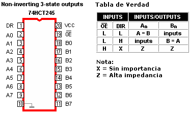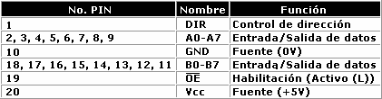 Este integrado tiene la ventaja de ser bidireccional, es decir todos los pin's A pueden ser entradas y los B salidas si DIR (pin1 DR) se encuentra a nivel bajo (L), el modo invertido se obtiene con DR a nivel alto. Si el terminal OE (pin 19) se encuentra a nivel alto (H) el integrado pone los pin's A y B con alta impedancia, es decir ni entra ni sale señal alguna, en ese caso el estado de DR no tiene importancia. En la siguiente tabla tienes los nombres de los pines y sus funciones correspondientes.