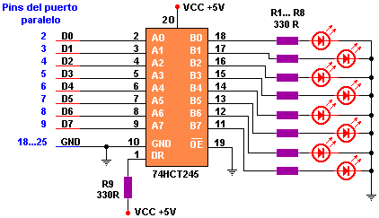 Para comenzar construiremos un circuito que nos permita enviar señales por el puerto paralelo y lo haremos utilizando diodos LEDs, como el consumo de los LEDs es superior al que nos envía el puerto utilizaremos un buffer como el 74HC244 o el 74HCT245, prefiero este último ya que la construcción de la placa será mas sencilla, aquí tienes los datos del integrado