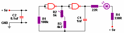 Este integrado contiene 4 operadores NAND en su interior, de los cuales dos serán utilizados para hacer un multivibrador que cumpla con las características indicadas, el esquema del circuito es el que sigue...