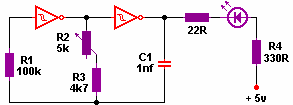 Este Integrado posee 6 compuertas inversoras, del tipo Schmith Trigger, de las cuales utilizaremos sólo 2, y montaremos un circuito similar al anterior, es más el circuito es el mismo, sólo cambian los operadores utilizados, observa...