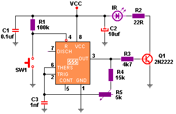Se debe establecer un pequeño filtro en la fuente de alimentación de todo el circuito, es por eso que se agregó un capacitor de 0.1uf. Puedes disminuir el valor de R4 para darle mayor intensidad al IR. igual que antes, con R2 puedes regular la frecuencia del circuito.