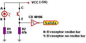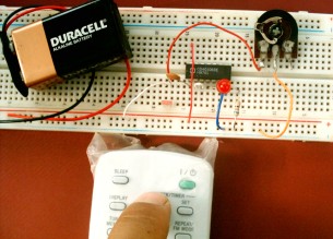 Este circuito te debe parecer familiar, y es que sí, lo vimos con los LDR, y no difiere mucho de los que ya conocemos, bien, este es el receptor, y para saber si realmente recibe la señal le colocaremos un LED, y enviaremos la señal con el Control del TV, así...