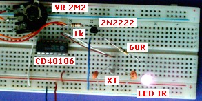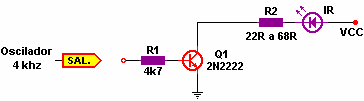 En todos los casos, es bueno hacer estas prácticas utilizando en la salida de los osciladores un transistor como el 2N2222, que es un transistor de batalla, el circuito para este transistor y el IR lo puedes ver en la siguiente imagen...