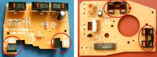 Al desmontar tu mouse, te encontrarás con 4 diodos IR y 4 fotodiodos, aunque en algunos te darás con 2 fototransistores (por lo general son negros) y sólo 2 IR, como los de la imagen... que más, un par de microswitchs, y una que otra cosita más, pero que ya no son de mucha importancia.