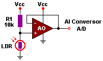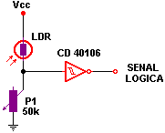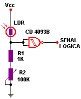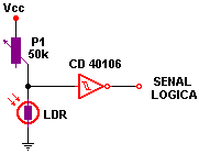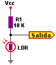 La fotocelda en total oscuridad puede llegar a tomar valores de 1M ...si no es más, y a plena iluminación a unos pocos k's o quizás menos. Lo que se puede hacer, es un arreglo entre la fotocelda al polo (-) y una resistencia fija al polo (+), de esa manera el punto de unión entre estos dos componentes podrá tomar dos valores según la variación de la LDR, señal que se puede utilizar como salida del sensor, este tipo de circuitos es conocido como divisor de tensión...