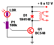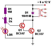 En este caso, la salida del divisor de tensión está en el cursor del potenciómetro, al iluminar la fotocelda se alimenta la base del transistor y este pasa a plena saturación. La sensibilidad del circuito se ajusta con P1. Respecto al modo de configuración de transistores para que trabajen en modo corte y saturación puedes consultar la siguiente sección... E.Digital --> Transistores